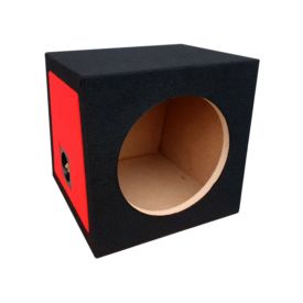 Obudowa zamknięta subwoofera samochodowego dla głośnika niskotonowego o średnicy 25 cm / 10 cali. Materiał - płyta MDF 18 mm. Objętość - 22 litry. Obicie kolor: Czarny - czerwone boki