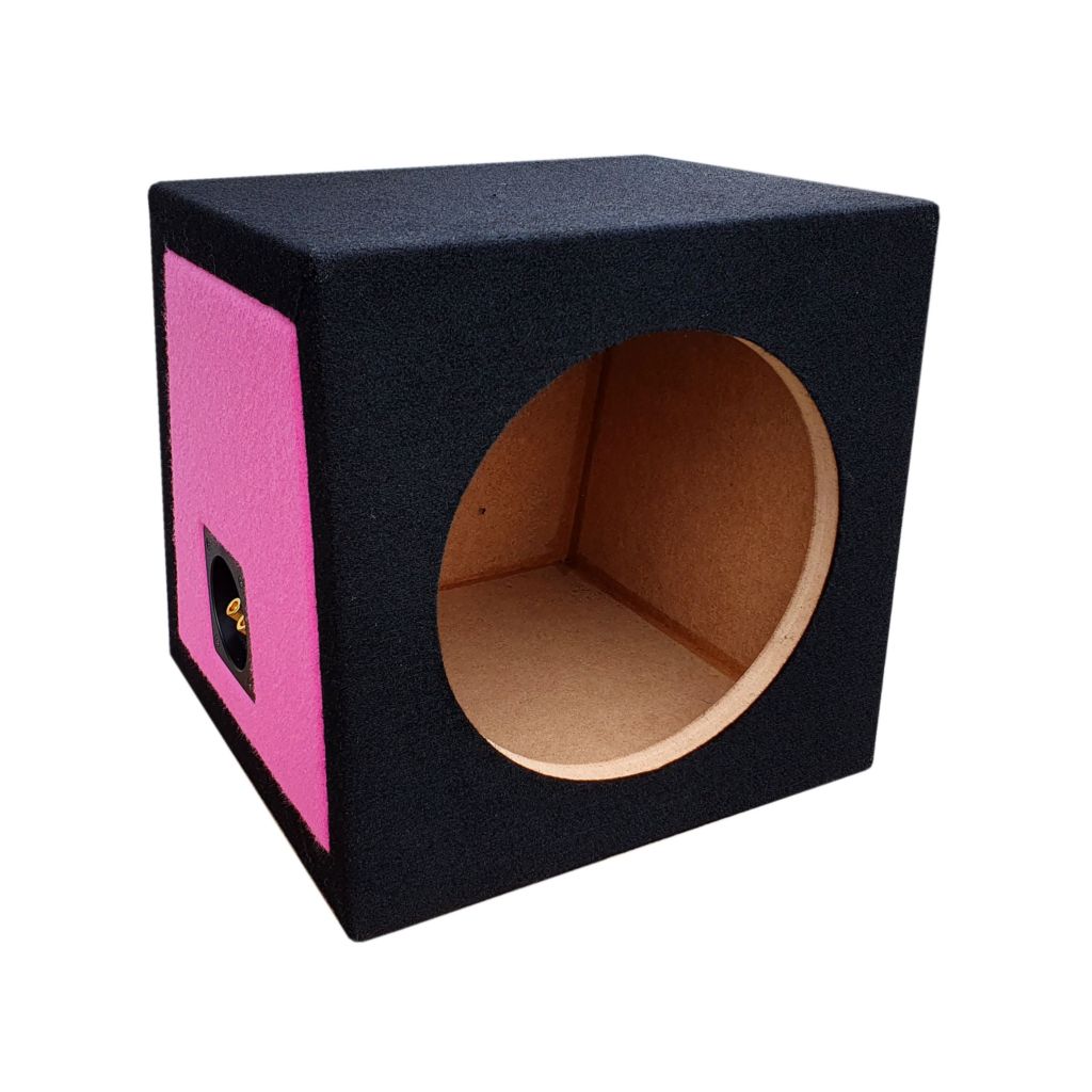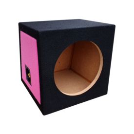 Obudowa zamknięta subwoofera samochodowego dla głośnika niskotonowego o średnicy 25 cm / 10 cali. Materiał - płyta MDF 18 mm. Objętość - 22 litry. Obicie kolor: Czarny - różowe boki