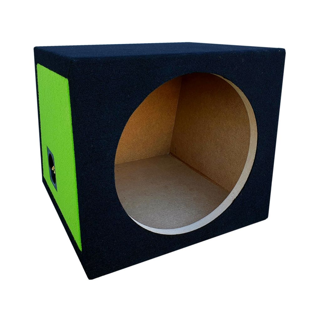Obudowa zamknięta subwoofera samochodowego dla głośnika niskotonowego o średnicy 30 cm / 12 cali. Materiał - płyta MDF 18 mm. Objętość - 33 litry. Obicie kolor: Czarny - zielone boki